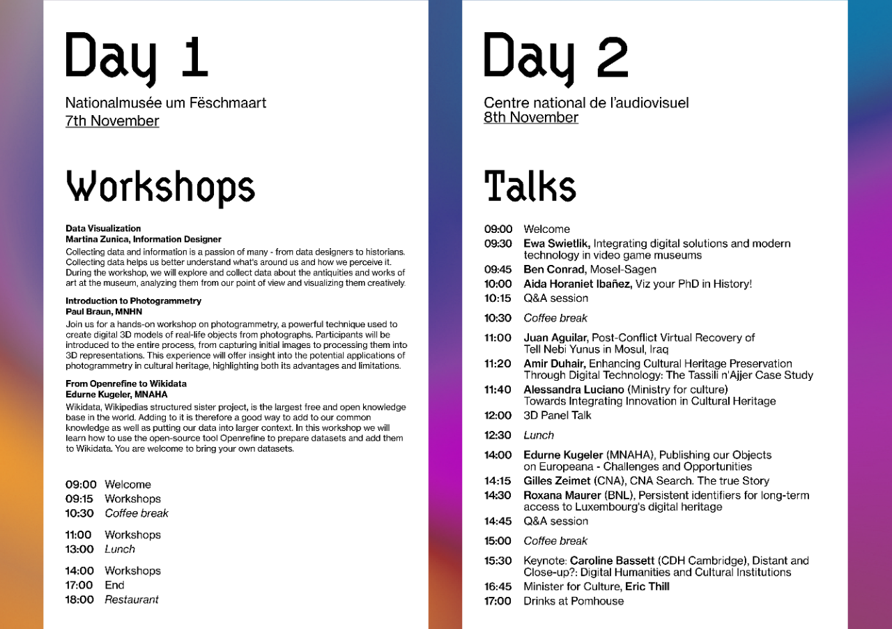 Join us for an inspiring two-day conference on 7 and 8 November 2024 filled with interactive workshops, engaging presentations and thought-provoking discussions about the use of digital tools within cultural institutions in Luxembourg and beyond. Don't miss this opportunity to connect, learn and contribute to the future of Digital Humanities. To sign up, complete our online registration form and send it to: servicedespublics@mnaha.etat.lu.