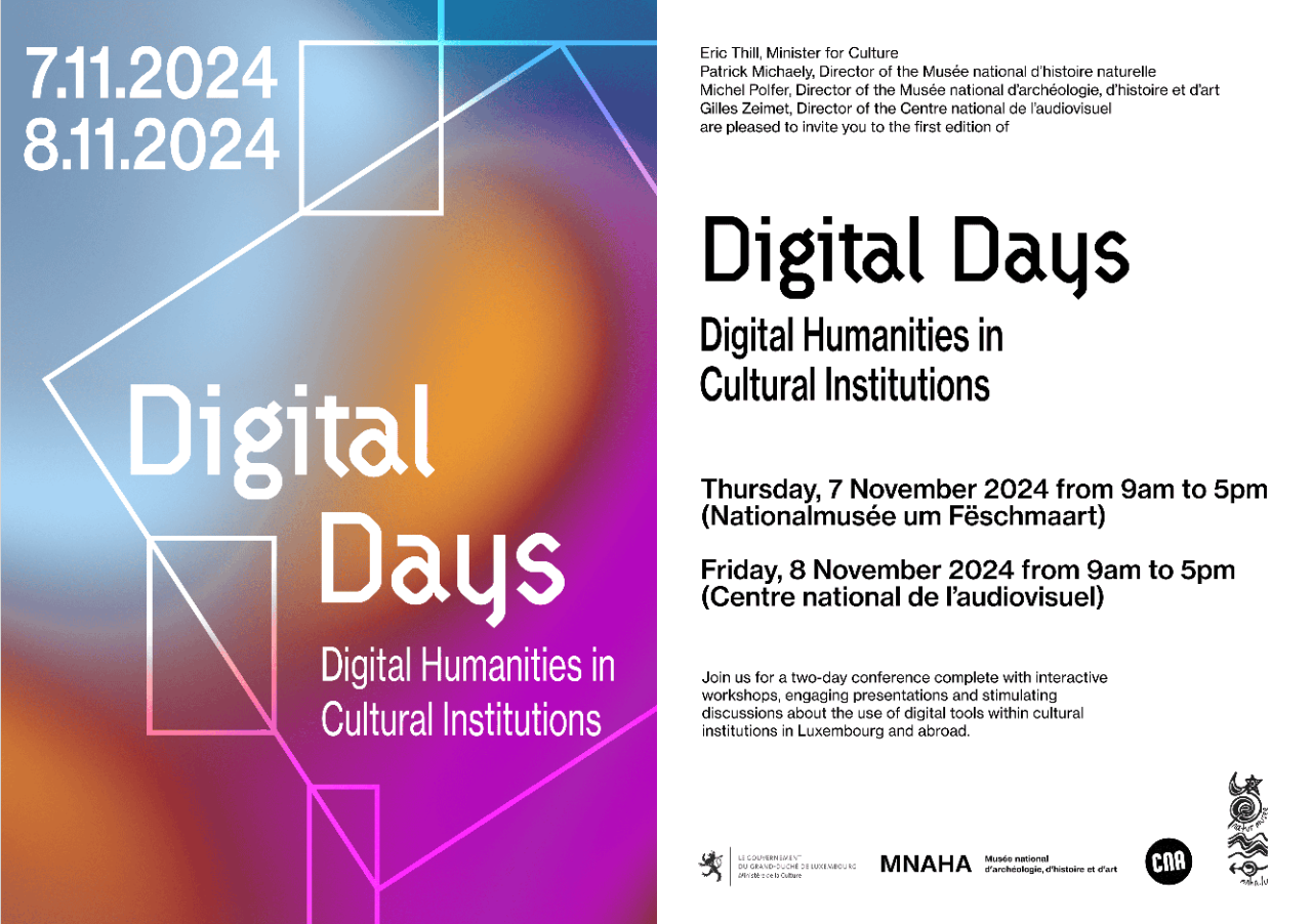 Le Musée national d’archéologie, d’histoire et d’art (MNAHA), le Centre national de l’audiovisuel (CNA) et le Musée national d’histoire naturelle (MNHN) sont ravis d’annoncer la première édition des Digital Days – un événement réunissant des expert.e.s en humanités numériques de toute l’Europe pour discuter des dernières recherches dans ce domaine dynamique.